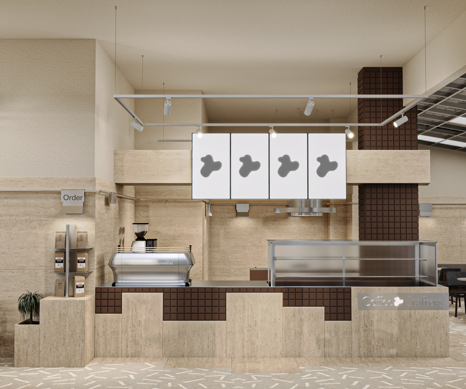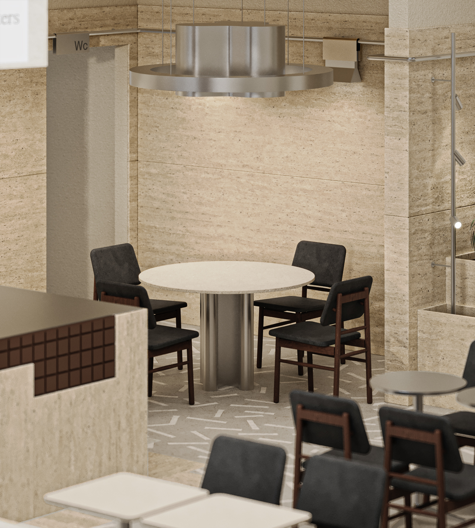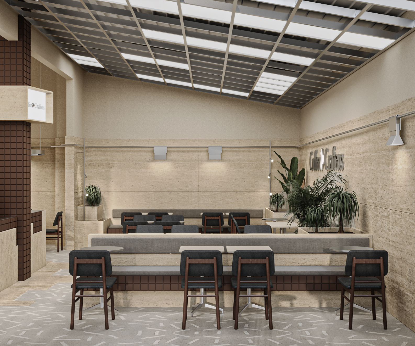 Cephede giriş tagında, bar kaplamasında ve oturma elemanlarında kullanılan kare form, malzeme farklılaşmasına rağmen tasarım dilinin sürekliliğini koruyor. Form tekrarı, mekânın farklı katmanları arasında görsel bir bütünlük kuruyor.